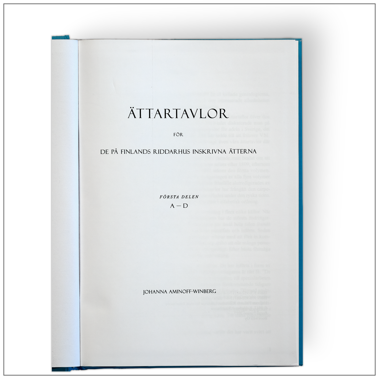 Aminoff-Winberg, Johanna: Ättartavlor för de på Finlands Riddarhus inskrivna ätterna, del I. Finlands Riddarhus, Helsingfors 2017. Inbunden, 643 s.